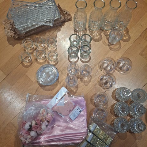 Diverse telysholdere, stearinlys, kubbelys og dekorstein