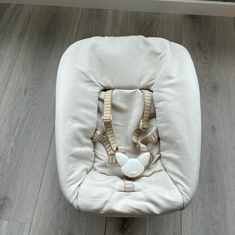 Selger delene til Ikea Stokke barnestol med putene som visst på bildene, Veldig pent brukt, som ny. Fordi jeg er mormor og de er ikke brukt hverdag.