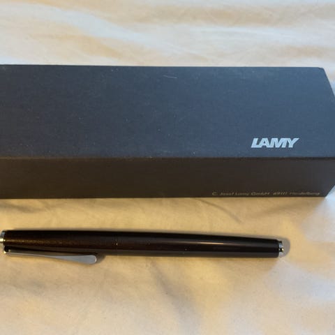Til salgs er en vintage Parker Lady Duofold i korallrød. Den er fullt fungerende og har F-spiss.