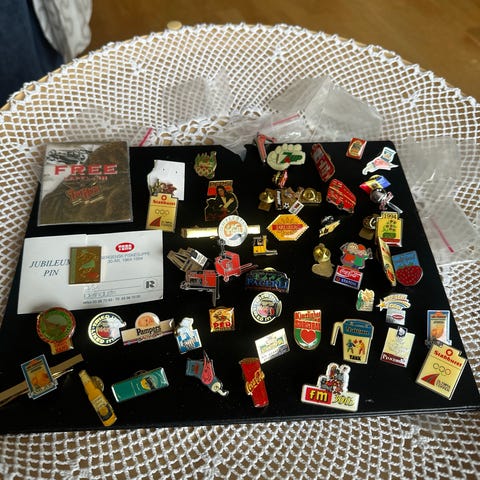 Samling av ulike pins festet i en ringperm. Pinsene varierer i design, farger og motiver, inkludert tall, flagg og ulike symboler. Passer for samlere eller som dekorative elementer.