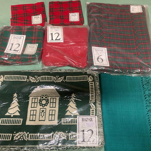 Kvit firkantet duk med glitter 90x90, kvit løper med sølvglitter 30x80 og rød løper 40x140 selges samlet kr 100,-. Alle fint og lite brukt.