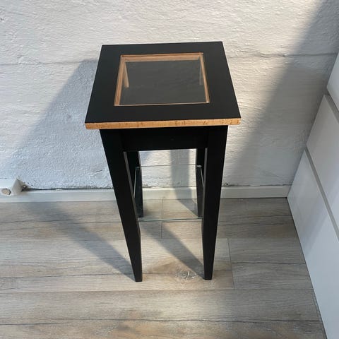 Selger et praktisk lite sidebord/pidestall i svart treverk. Perfekt til lampe, dekor, planter eller småoppbevaring.