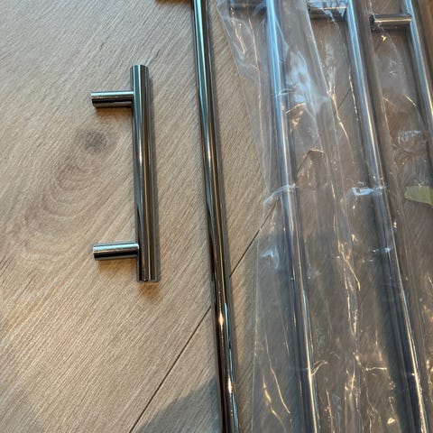 2 stk Biltema Håndtak i rustfritt stål med lengde på 137 mm og senteravstand på 96 mm. Produktet inkluderer monteringsskruer og er egnet for montering på dører eller skap.