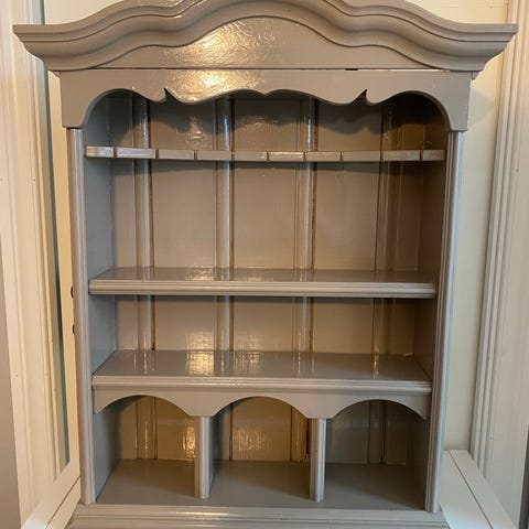 Veggreol av beiset tre. Usikker hvilken tresort det er