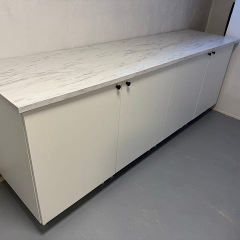 Vi selger ubrukt nydelig skap med benkeplate til bad. Benkeplate er ikke montert. Bare ligger over til bilde. Selve møbler er skrudd på. 4 skuffer. Det stod ubrukt. Vi ble ikke ferdig med bad og måtte kjøpe mindre skap til slutt.