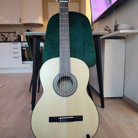 Akustisk gitar i svart farge. Passer for ulike musikalske formål og spillestiler.