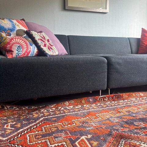 En liten flekk bak på den ene ryggen, ellers fremstår sofaen som veldig pen.