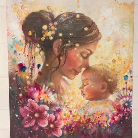Jeg har latt meg inspirere av det som har berørt meg dypest i livet. Å få være en mor. Jeg håper dette maleriet gir deg glede.