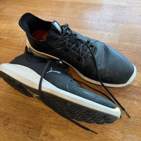 Puma golfsko i størrelse 43. Skoene har en svart overflate med røde detaljer og knotter på yttersålen.