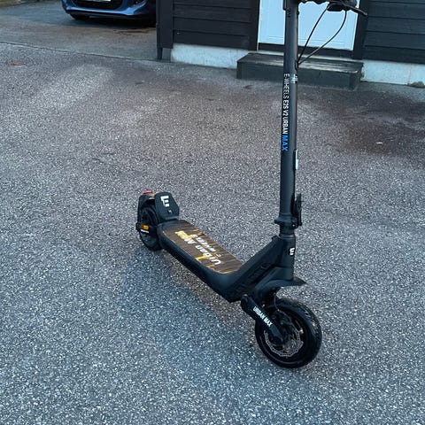 Hei. Jeg selger min E-Wheels Urban Max fordi jeg har kjøpt meg sykkel. Denne sparkesykkelen er i god stand, har noen få riper, den har kjørt litt over 1000km å er ca 10-11 måneder gammel. Jeg har spray malt den helt svart, tatt på ny grip tape over den orginale, festet lilla innfelt skiver oppå griptapen og tatt på kabelbeskytter på kablene.
