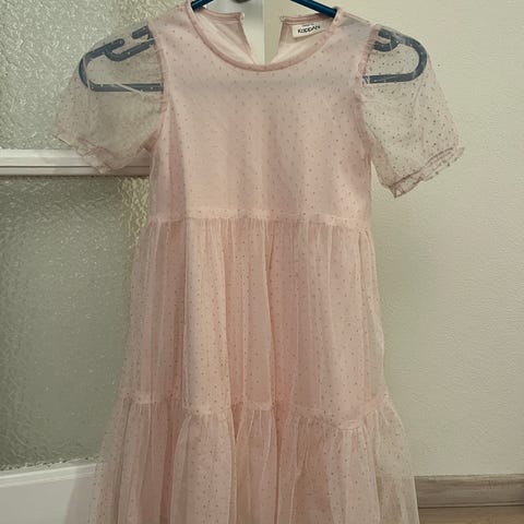 KappAhl barn kjole i størrelse 116, designet for jenter. Kjolen er rød og har et dekorativt to rådyr på overdelen. Den har lange ermer og en skjørt med flere lag av tyll, som gir et voluminøst utseende.