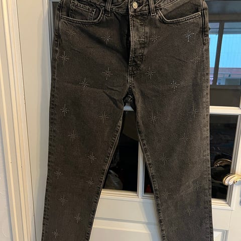 bukser i størrelse M, svart farge med paljetter. Designet for kvinner.