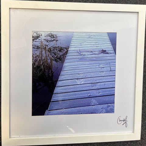 Trykket er montert i svart ramme med hvit passepartout og glassfront, og signaturen er plassert nederst til høyre.