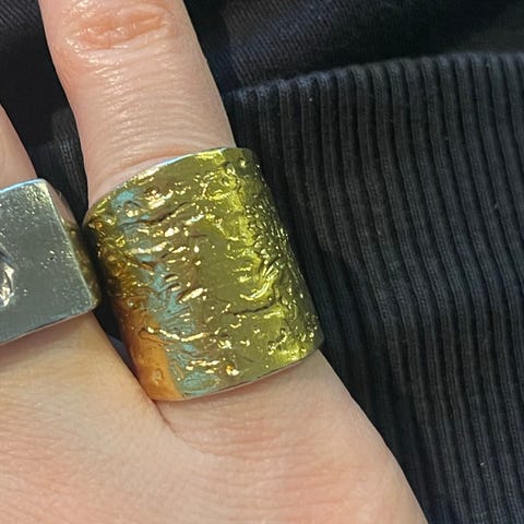Vakker ring i gullbelagt sølv med avrundet form. Hul på innsiden. Str 56, brukt en gang eller to. Kommer i original eske.