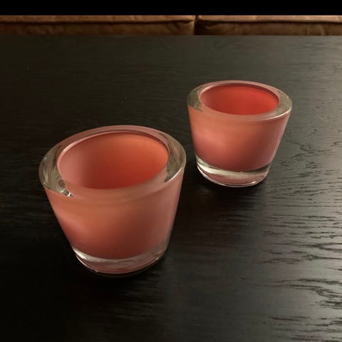 Lekkert og moderne sett med tre høye lysestaker i klart glass med matt lilla skåler på toppen. Gir utrolig fint lys når de er tent (se bilder). Perfekt til stue, spisebord, vinduskarm eller som dekor på fest/bryllup.