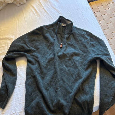 Tilstand? Pent brukt, men har et hull i ribben på ene armen (se bilde). Har som vanlig valgt å ikke bruke egne middelmådige syferdigheter på stopping (= har foreløpig ingen passende farge + antar at hele norges bruktkjøperskare kan gjøre det bedre). Forbehold om nupper, løse tråder og hull jeg ikke har funnet. Pris justert.