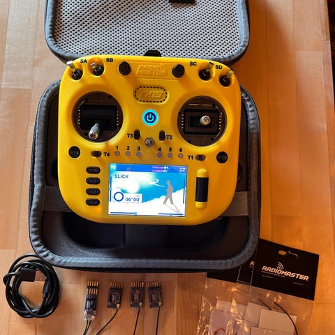 Eldre mhz helikoptersender, virker heilt fint. Medfølger mottaker og en koffert. Har også noen eldre servoer som kan føle med.