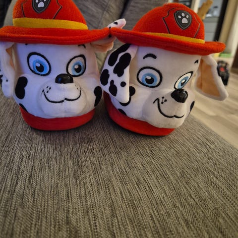 Pent brukte Paw patrol-tøfler selges. Brukt i bhg til ett barn. Litt små i str. de måler ca 15 cm fra tå til hæl på innsiden. Kommer fra et røyke- og dyrefritt hjem.
