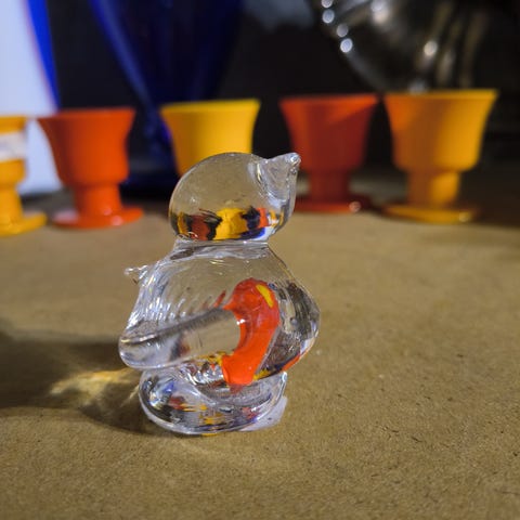 Pyntegjenstand med høne og fugl i glass, med oppheng til å henges opp.