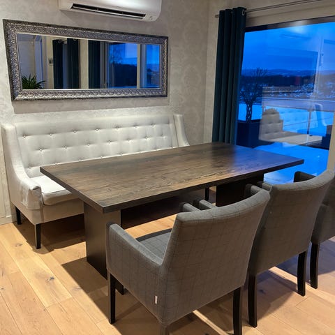 Flott salongbord til salgs. Solid og elegant med massiv eik plate og stål understell. Meget pent vedlikeholdt- ingen skader, eller riper.