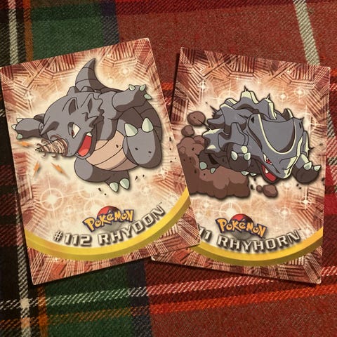 Nydelig Brock’s Rhydon fra 1998. Pen swirl, og etter min mening den flotteste baksiden av alle pokemon-kort.