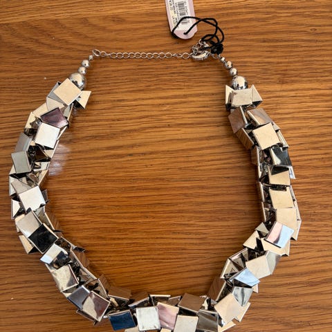 Smykket er i svart metall med svarte stener. Kan brukes på to sider. En side med stener og på baksiden er det glatt metall. Lengde 48 cm. Kan brukes tett rundt halsen eller lengden kan varieres og henge litt ned på brystet. Kjøpt på en italiensk butikk i Oslo. Smykket kan sendes med posten.