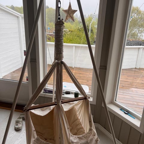 Vi selger vår kjære Moonboon tvillinghengevugge – en absolut redning de første månedene! Denne har gitt oss utallige timer med ro, søvn og etterlengtet egentid. Nå har tvillingene våre vokst ut av den og sover i vogn, så vi håper den kan komme noen andre små til glede 💛