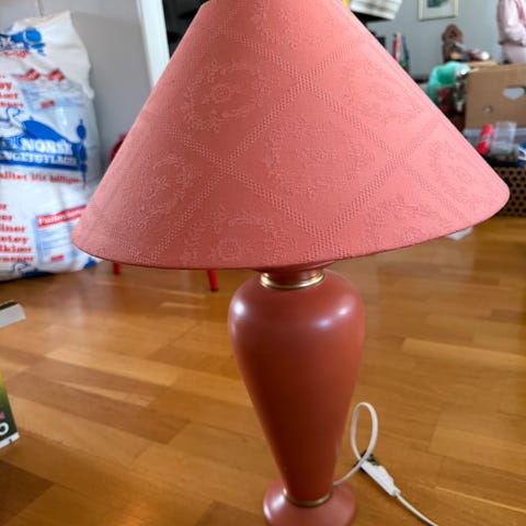 Pent brukt bordlampe som gir varmt lys i stua. Alt funker som det skal.