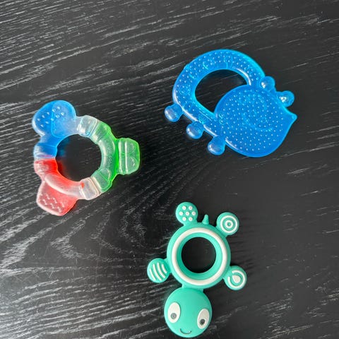 Tre biteringer - den fargerike er også en leke, som rangler, og kan vris på. Den hvite (fra Twistshake) har væske inni som kan fryses i fryseren som er veldig behagelig for små med såre gommer. Den siste er i en kombinasjon av tre og gummi, med forskjellige ‘tagger’.