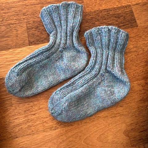 Grønne hjemmestrikkede ullsokker til baby, myke og gode. Se de to siste bildene for mål