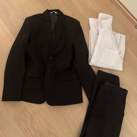 Selger ei stor pakke med penklær til gutt som er i svært god stand. Inneholder ei hvit skjorte fra Hennes og Mauritz som har blitt brukt to ganger. Ingen flekker, hel og i orden.
