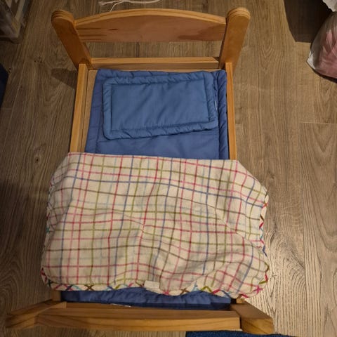 En håndlaget dokkeseng laget i rotting. Et fint lite møbel laget i Norge av P.I. Langlo.