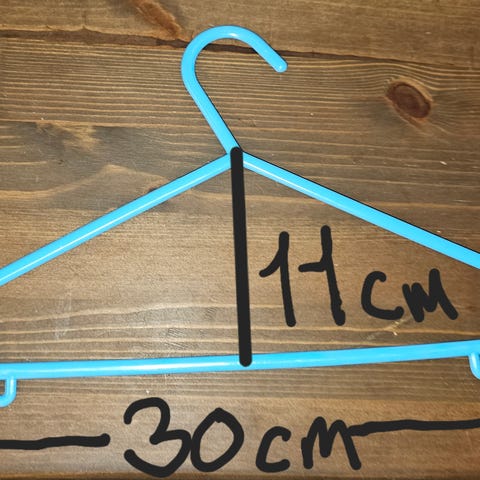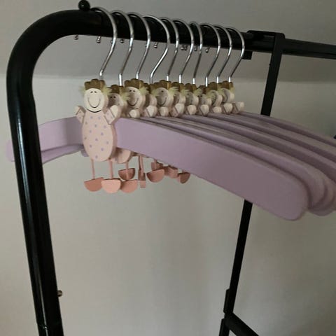 IKEA barneklærhengere laget av plast i forskjellige farger, flest rosa. Egnet for oppheng av barneklær og sparer plass i garderoben.
