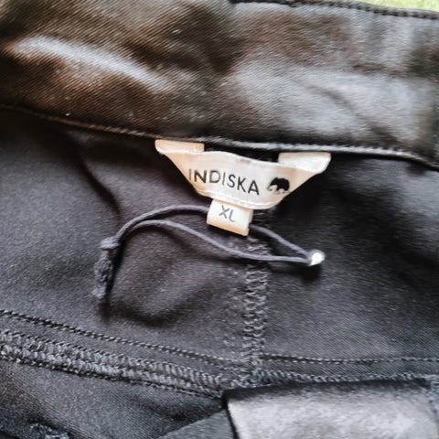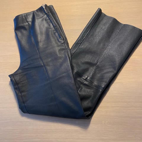 Buksene er laget av smidig skinn og har en fin bootcut-flare. De har en komfortabel elastisk midje og en diskret glidelås på siden for en jevn passform. Buksen fremstår mye bedre enn jeg får frem på bildene. Kun brukt en gang. Har ikke merker eller skader.