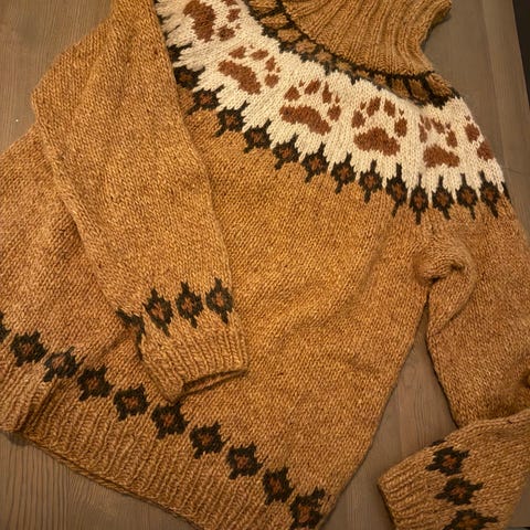 Grå med blå poter Strikket i dobbel Letlopi som tilsvarer alafosslopi. Str.L .