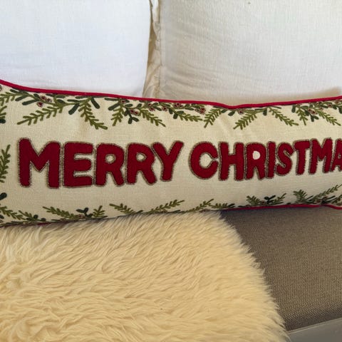 &Tradition løper med julemotiv i brodert tekstil. Løperen har lys bunnfarge med røde kantstriper og korsstingsbroderi med kongler, sløyfe og teksten «Gledelig jul». Egnet som bordløper i julen eller til annen sesongdekor der man ønsker et enkelt, tradisjonelt uttrykk.