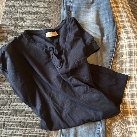 Inneholder forskjellig type klær, som skjørt, kjole, t-skjorter, tynn genser osv. Det meste er lite brukt. Er totalt 16 plagg.