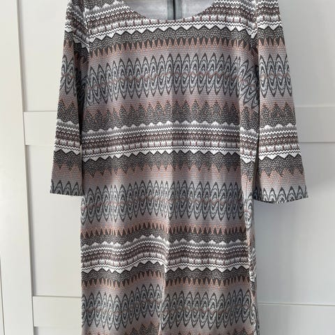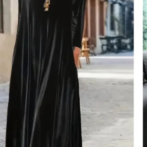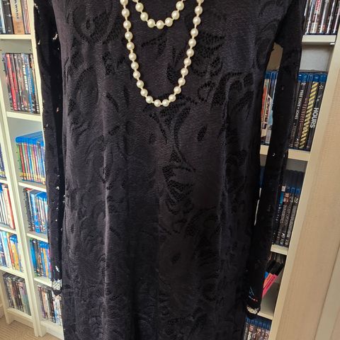 Vila kjole i størrelse XL, svart farge( men ser grå ut på bilde)laget av 100% polyester. Kjolen er langermet og faller fint pga litt tyngde i stoffet. Litt vidde i fasongen. Integrert underkjole. Lite brukt.