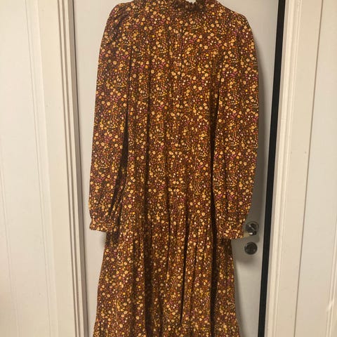 Har litt volang i skjørtet, bredt strikk i livet, litt vide ermer med strikk nederst, rund hals og lang glidelås bak.