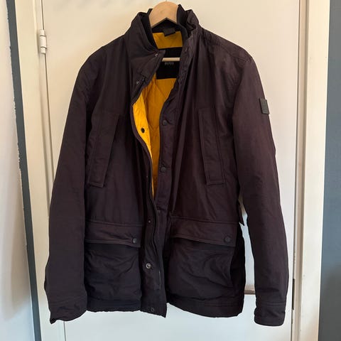 Selger en klassisk og pen Hugo Boss-jakke i størrelse 52. Farge: mørk brun. Modellen er laget i 100 prosent virgin wool (schurwolle), noe som gjør den både varm, slitesterk og av høy kvalitet. Jakken har ribbestrikket kant nederst, lommer i front, skjult glidelås og knappelukking.