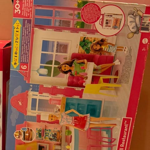 Barbie lekesett med ulike møbler og tilbehør, inkludert badekar, kjøkkenkomfyr, speil, noodle bord og tallerken. Passer til lek og innredning for Barbie-dukker.