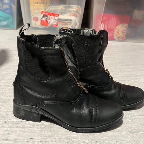 Mountain Horse ridestøvler laget av skinn i svart farge. Støvler med glidelås foran for enkel på- og avkledning. Str 36/37. Chaps str 11-13 år, passer nok bedre til en på 11 enn 13. Sikkerhetsvest med justering i sidene. Ingen skader.