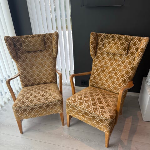 To veldig pent brukte stoler i grønn velour fra 60 tallet. Komfortable å sitte i, ingen lukt og kommer fra et røykfritt hjem.