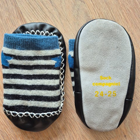 Mokasiner fra polarn o pyret selges. Dette er tøfler/sokker med skinnsåle som gir godt grep. Vi har hatt en liten gutt som elsker å dra av seg sokkene. Så antisklisokker har ikke fungert like godt her i hus. Mokkasinene er vanskeligere for pjokken å dra av i tillegg til at han holder seg både varm på beina og sikrer at han ikke sklir på det glatte gulvet. 10 av 10 sokker/tøfler dette