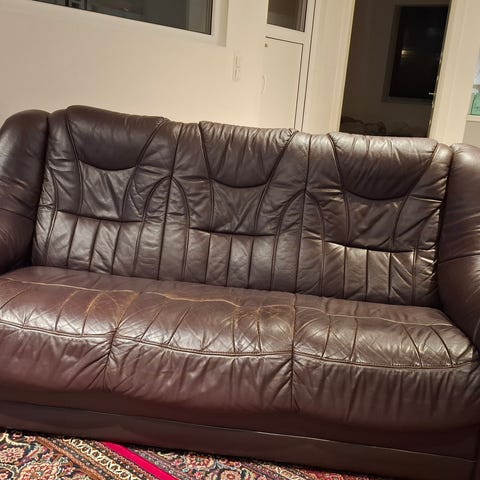 Mørkebrun 3-seter skinnsofa fra IKEA (antageligvis KRAMFORS) uten synlige merker eller hull.