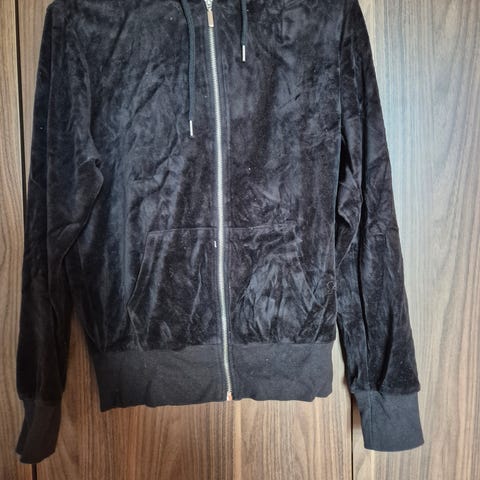 KappAhl hettejakkei svart farge, størrelse XXL, laget av bomull med 25 % polyester. Genseren har glidelås med ringdetalj og lommer forann