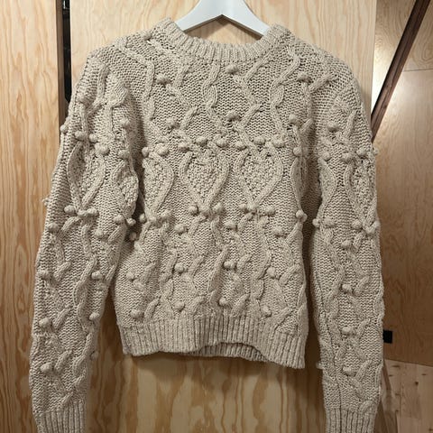 Fin og varm genser selges, skulderputene følger med og kan syes i igjen. Sender gjerne mot at kjøper betaler frakt.