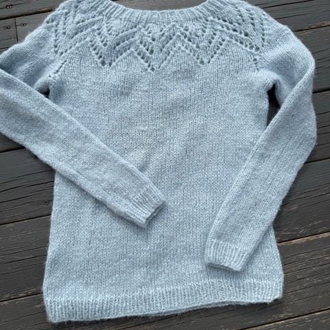 Pent brukt hjemmestrikket ullgenser - Tirilgenser med hullmønster. Strikket i str 6-8 år,men passer nok best fra ca. 5-7 år.