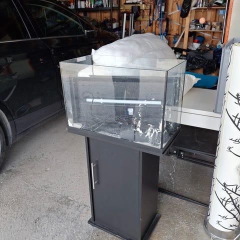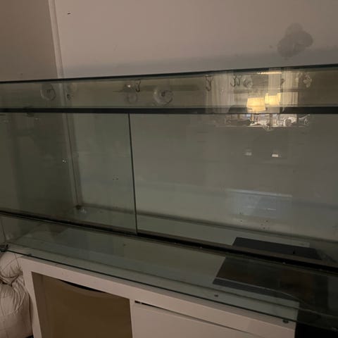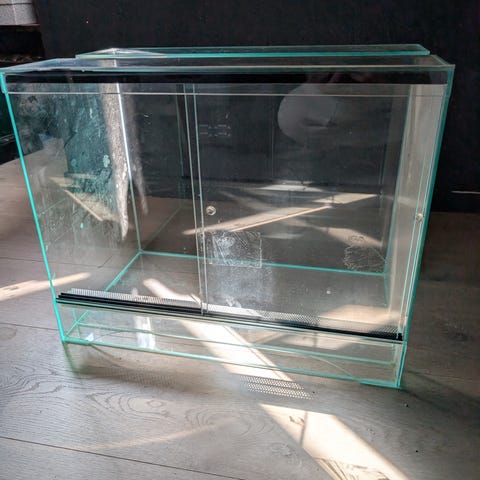 Fint terrarium. Skyvedører, lufting, får med vegg/bagrunn som passer til buret. Det er ny lyspære i amaturen, men lyset virker ikke.