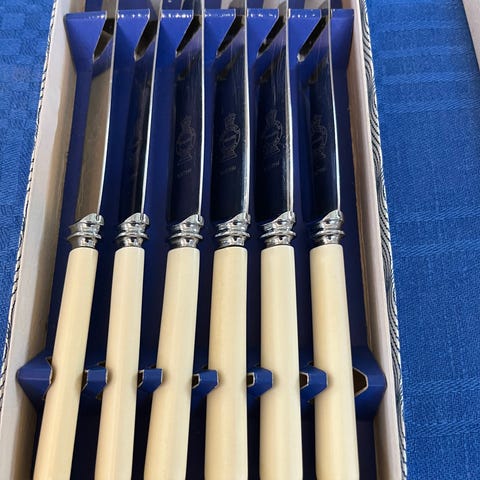Tilstand: Pent brukt, men bladet på knivene har en del riper. Sendes i orginaleskene, men de har synlig slitasje.
